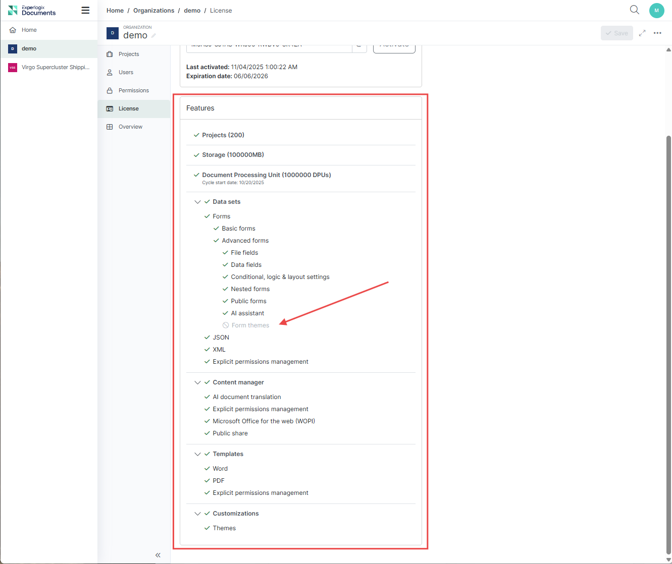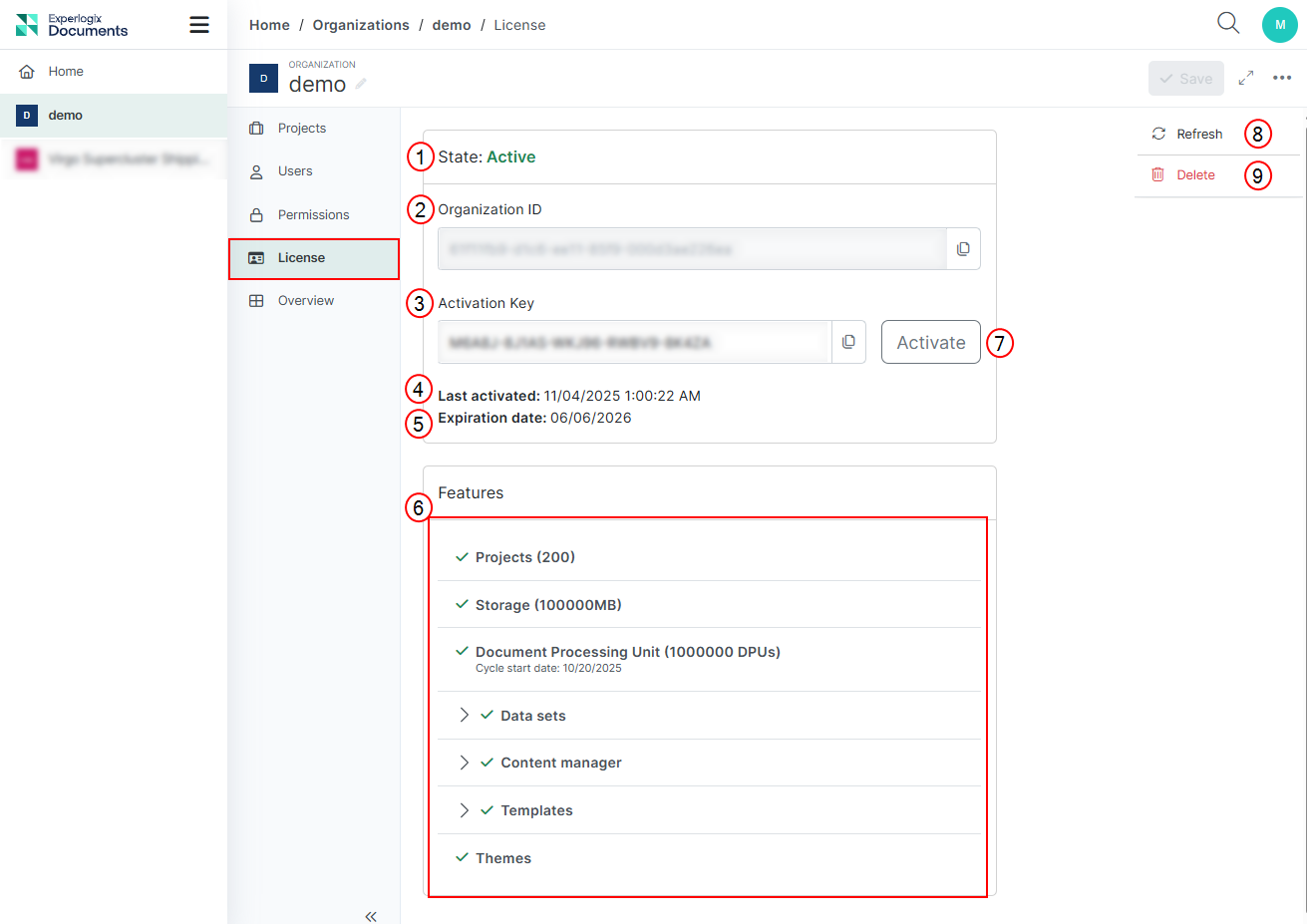 In the License section of the Organizations screen, you can view detailed information about your license. You can check its current status, see which features are included, review its validity period, and activate a license if you have the necessary permissions.