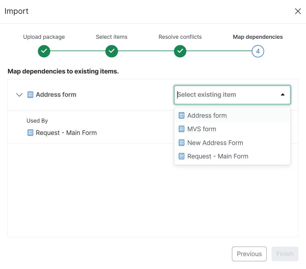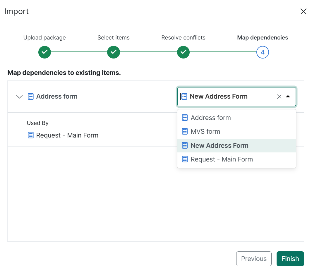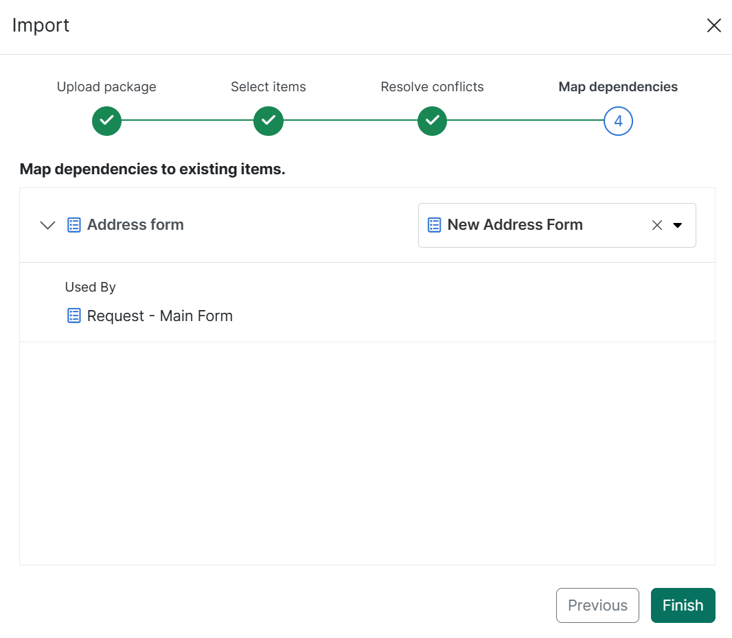 To ensure the import is successful, the system prompts you to map this dependency to an existing resource. At the "Map Dependencies" step, simply pick a replacement from the list of forms available in the destination to link it to your Request - Main Form.