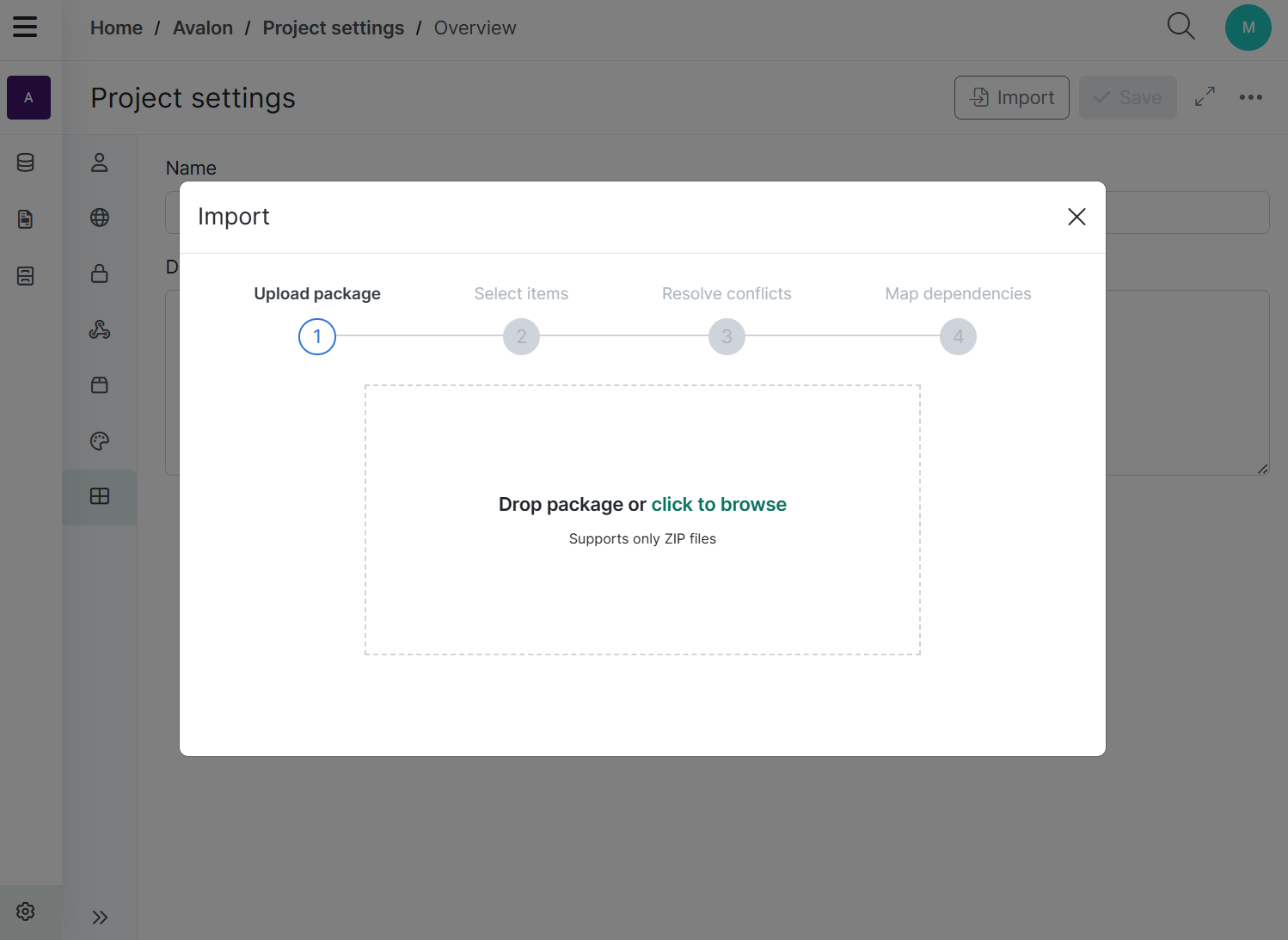 Importing items allows you transfer exported data where it’s needed. Users can import items with or without their dependencies. This section provides a brief outline of the import workflow, describing the steps for adding items into the system and managing their dependencies during the import process.