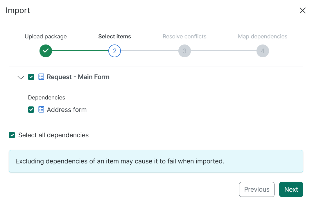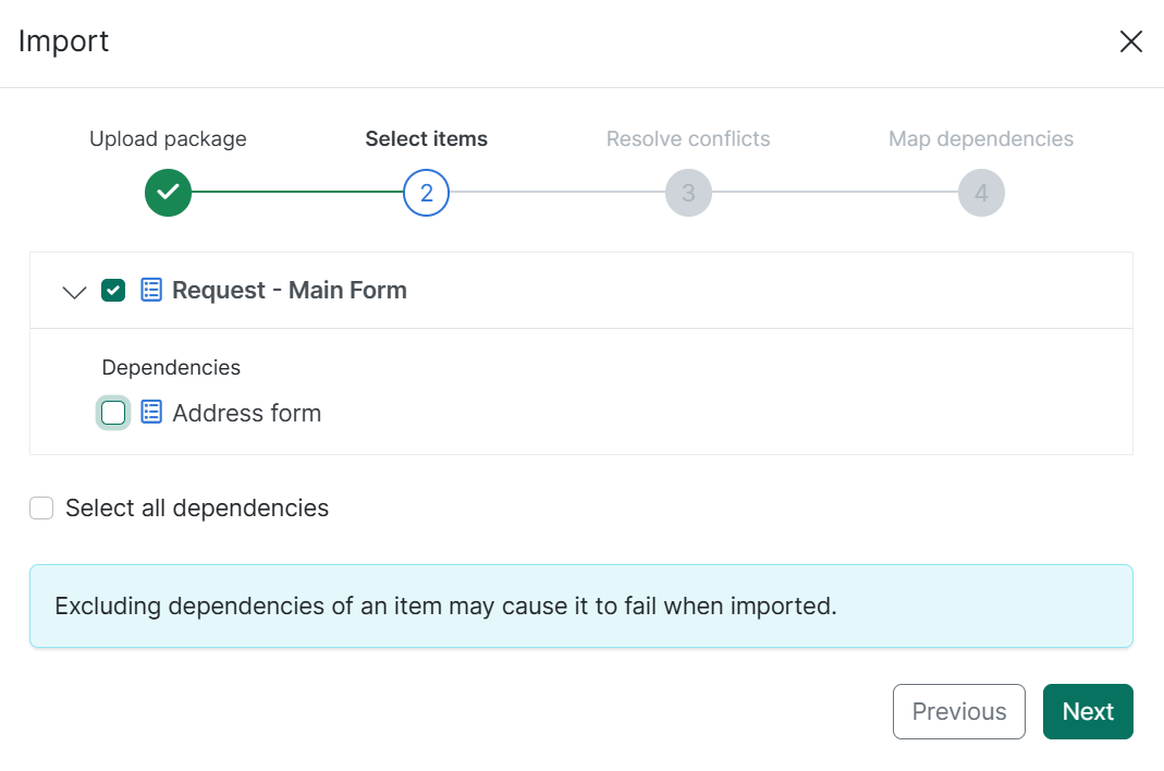 You are importing a Request - Main Form but decide not to include its nested Address Form from the package, because you already have a New Address form in the destination project and want to use it instead.