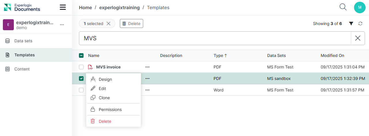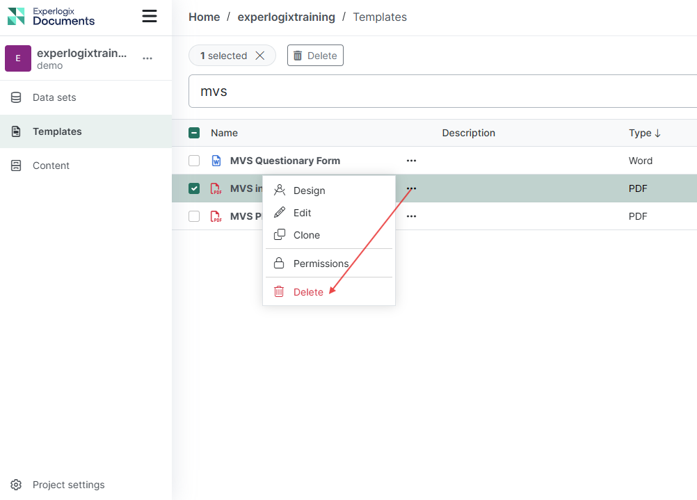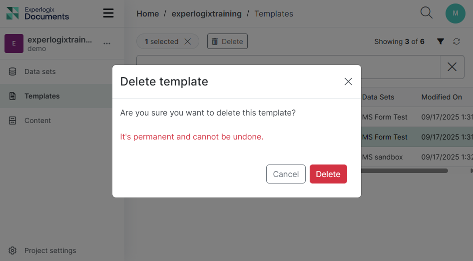 | Delete | Deletes the template and its relationships permanently. This action does not delete data sets used for the template. |