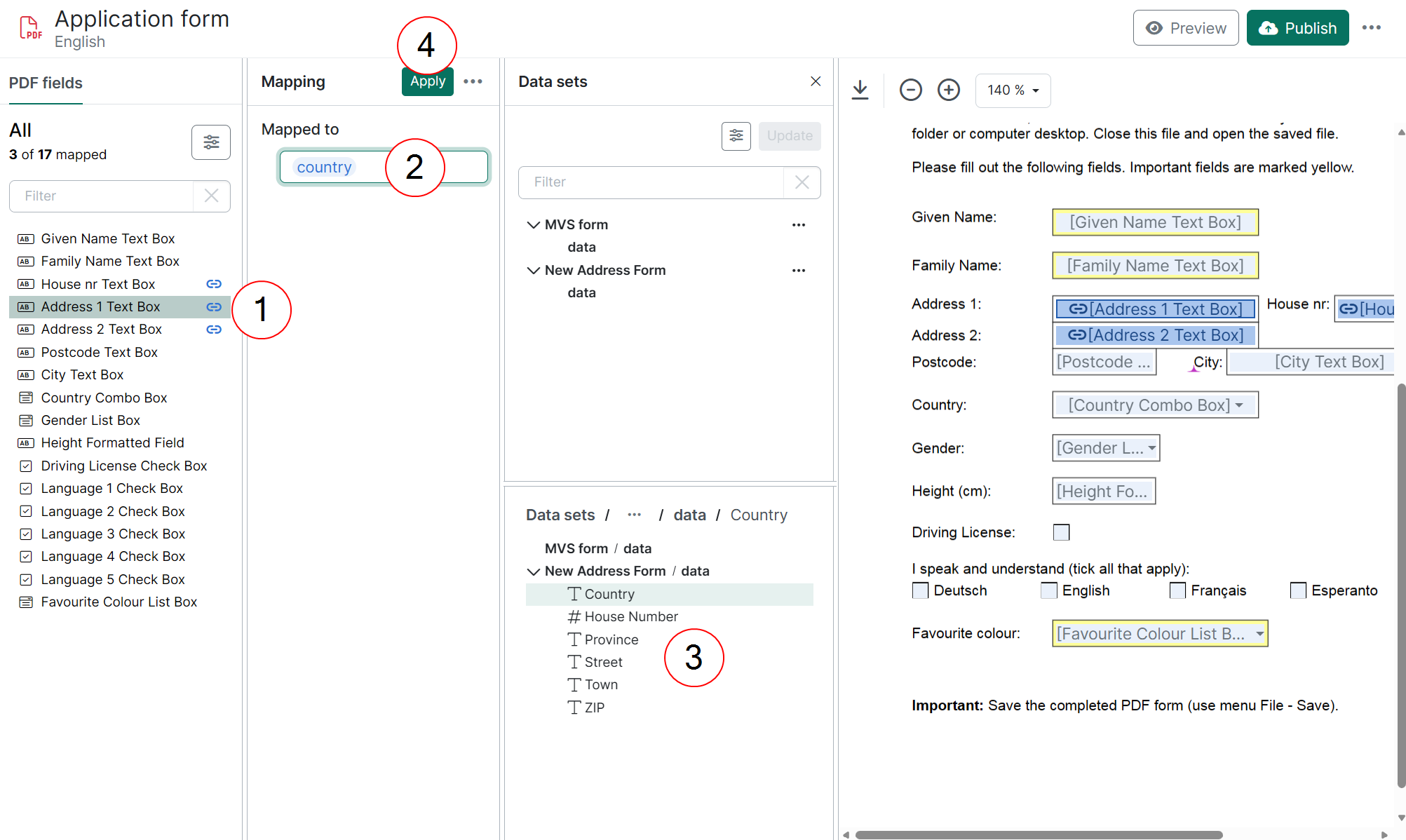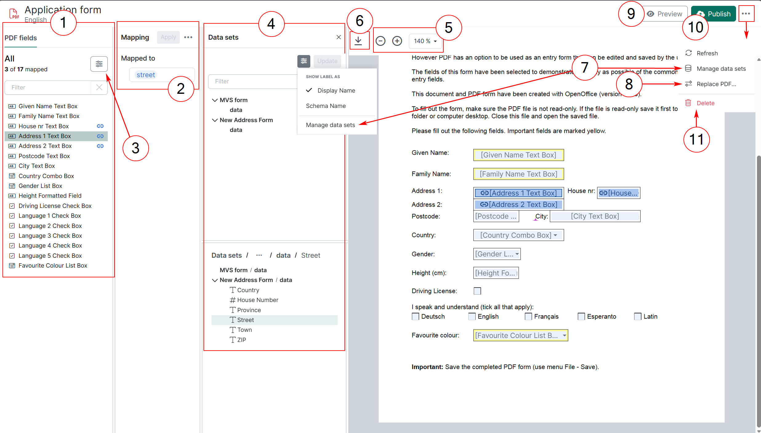 | 2. | Design a PDF template: Map PDF fields to corresponding Data Set fields, and add logic to your PDF template. |