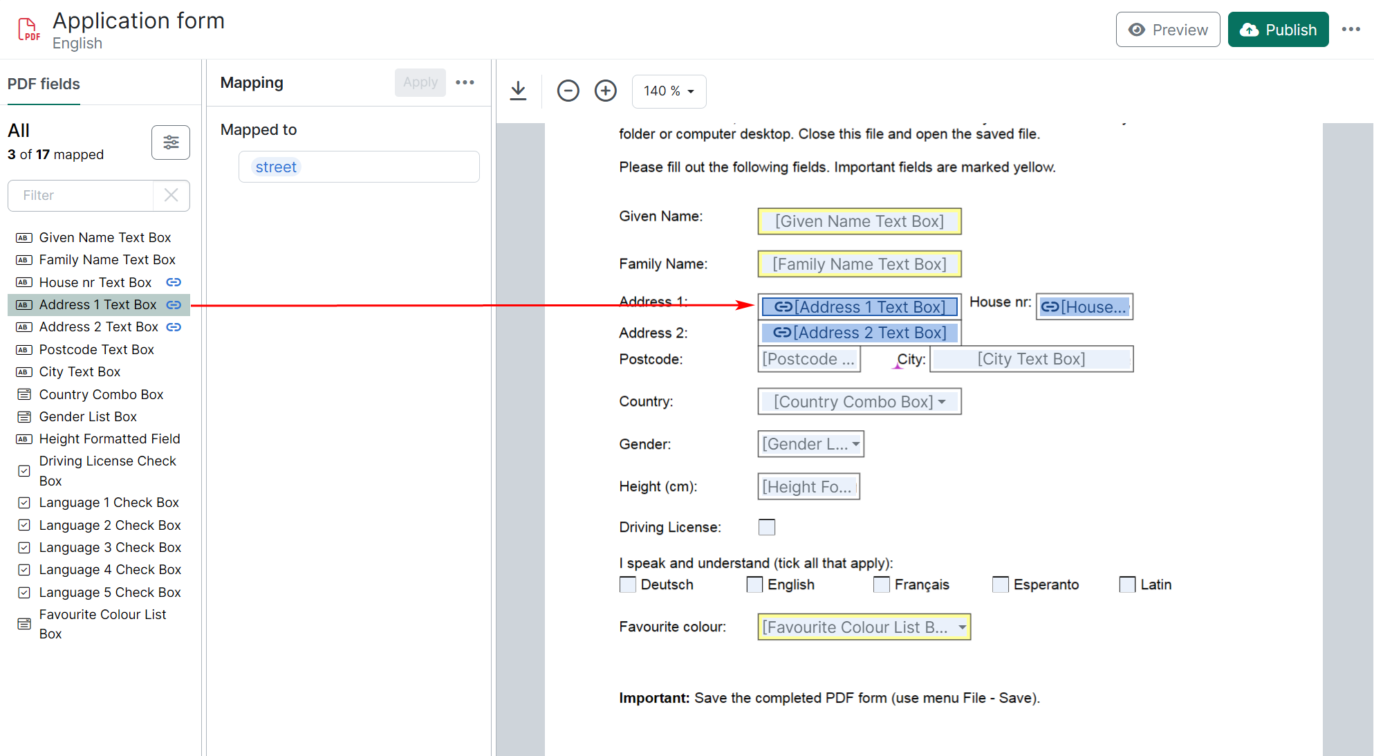 If a PDF field appears multiple times in the document, the same mapping isautomatically applied to all of its occurrences.