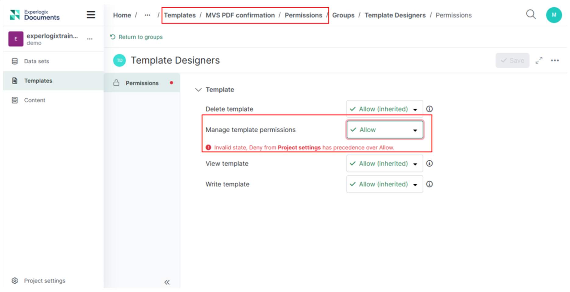 If a Template permission in Project Settings is set to Deny, it cannot be changed to Allow in the Template permissions within the Template Edit View.