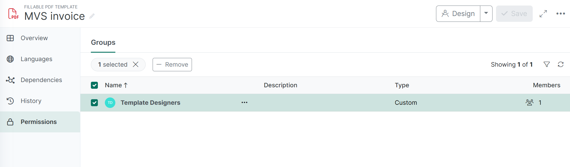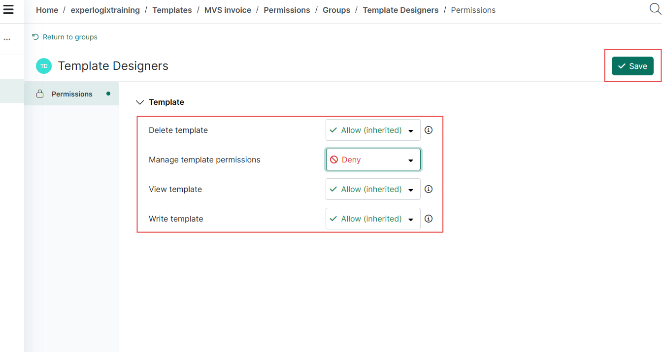 | 4. | After success message displays, you can find the group visible under Permissions in the Template Edit view. |