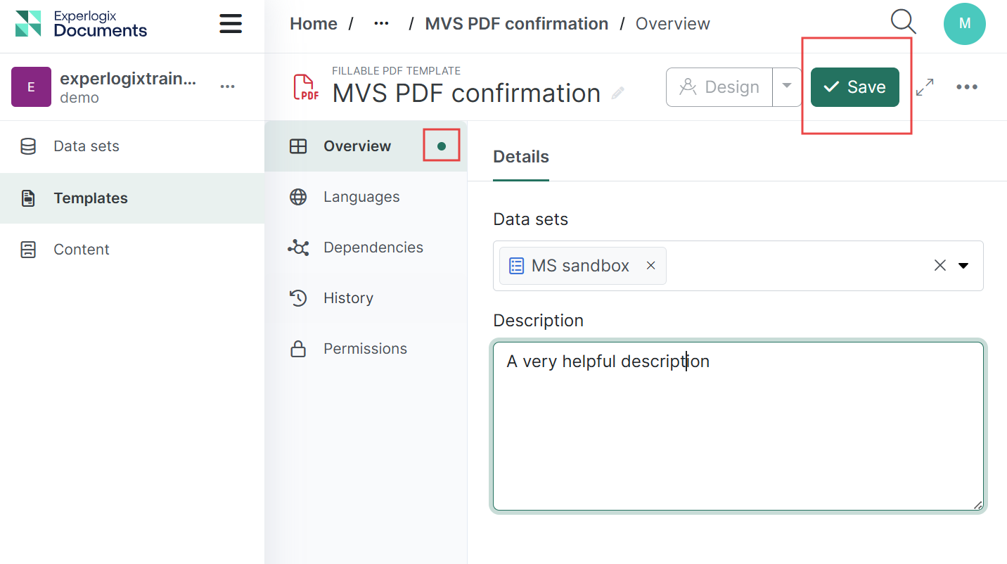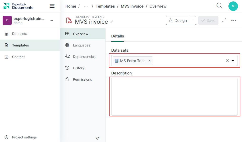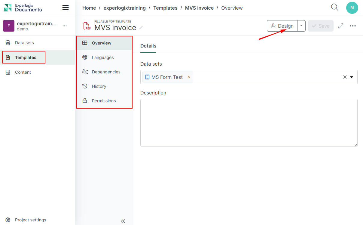 The Template Edit view allows users to update the template name and description, organize template Data Sets, manage template languages and dependencies, review template history, and configure permissions. The Design button is also available in this view.
