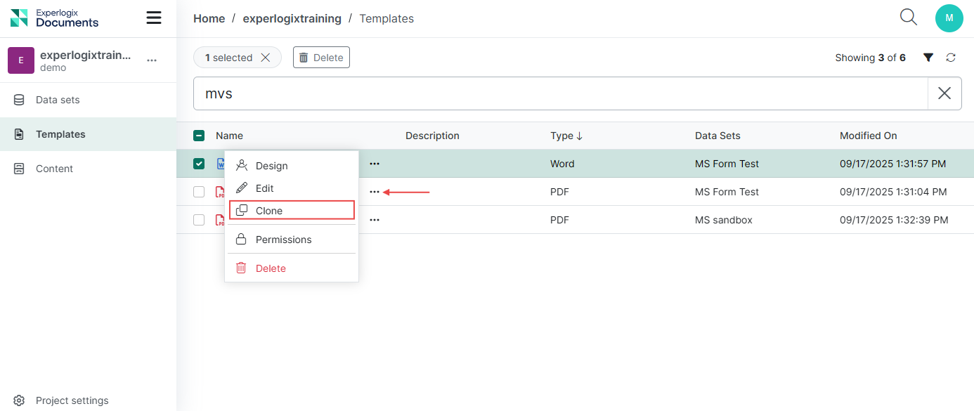 | 2. | Select Delete from the Actions menu (⋯) on the right to the Template name. |