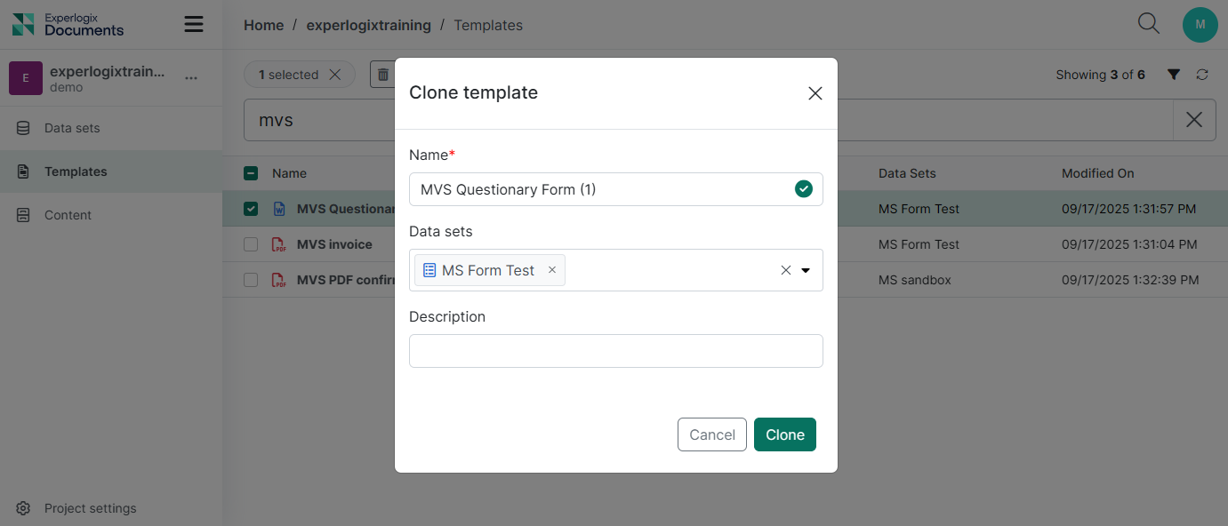 | Clone | Clones an existing template so you can quickly create a new one using its data. See Cloning a Template for more information. |
