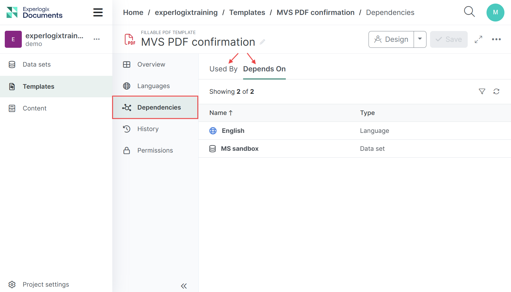 Learn which items use your template (used by) and what it depends on. You can access dependencies from this section. |