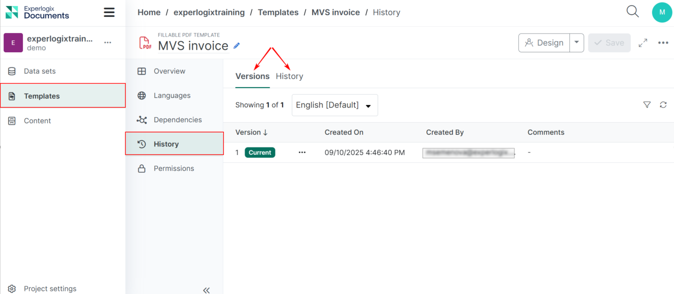 Lists all available template versions, individually for each language variant. A new version is generated when the template content is updated or when a rollback to a previous template variant is performed. |