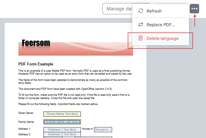 | 10. | Delete: This action will delete the PDF template language variant. Select the ellipsis menu (⋯) in the top right corner, and select Delete language from the list. |