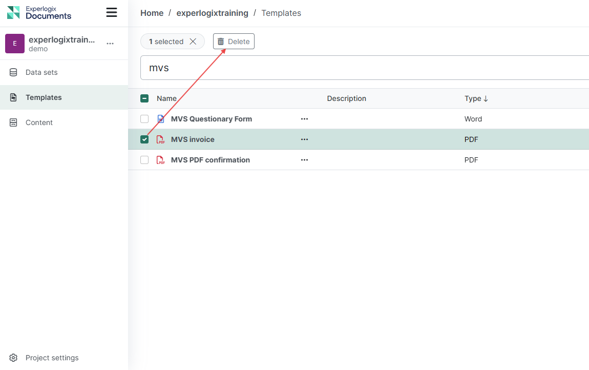 | 1. | Select a Template you want to delete. This will activate the Delete button. |