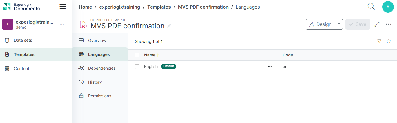 Create a new language version: Open the dropdown menu of the Design button and select one of the Available languages. This will direct you to the Design interface of the selected template. (PDF or Word)