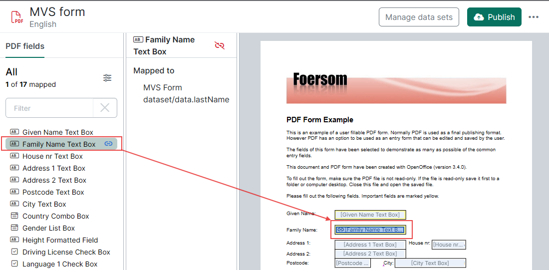 Mapping is the process of binding individual fields in a PDF template to specific data fields in a data source, such as a Form field or an XML node.