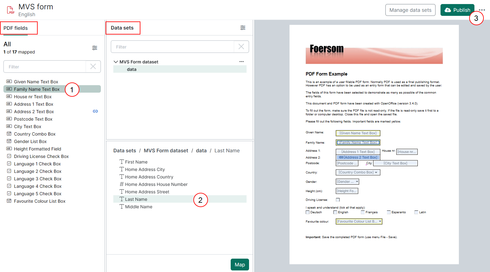 Users map PDF fields to corresponding data set fields, enabling the template to retrieve the necessary data during document generation.