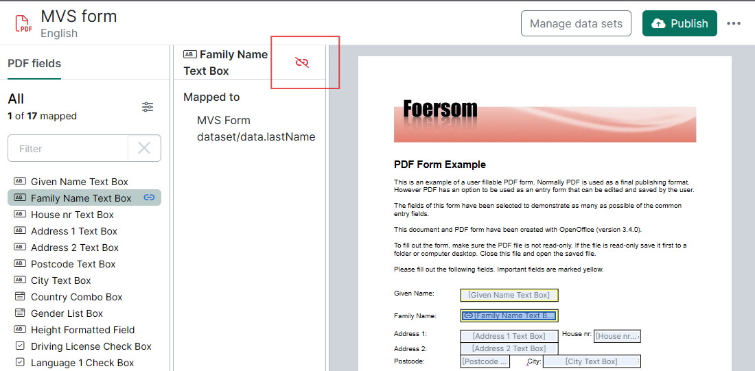 | 3. | The PDF field is successfully unmapped from the Data Set field. The mapping icon is no longer displayed next to the PDF field. |