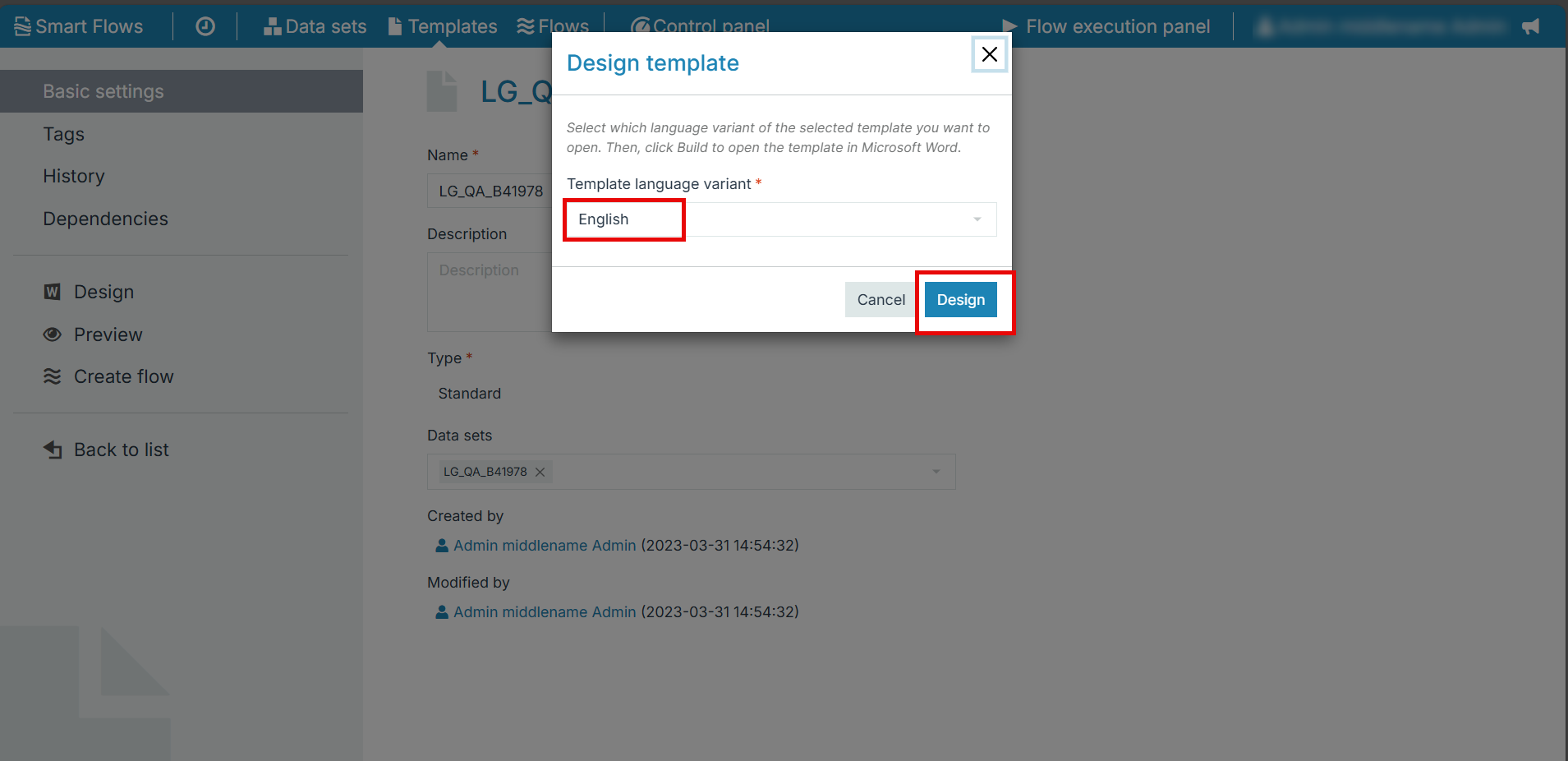 Select a language variant from the drop-down and select Design. |