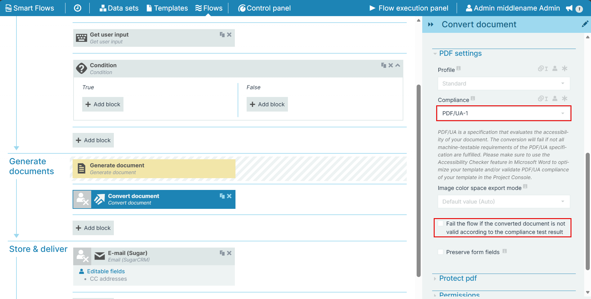 When checked, the compliance test result is displayed in the flow output. (true/false). This output is relevant only for 'PDF/UA-1' type. |