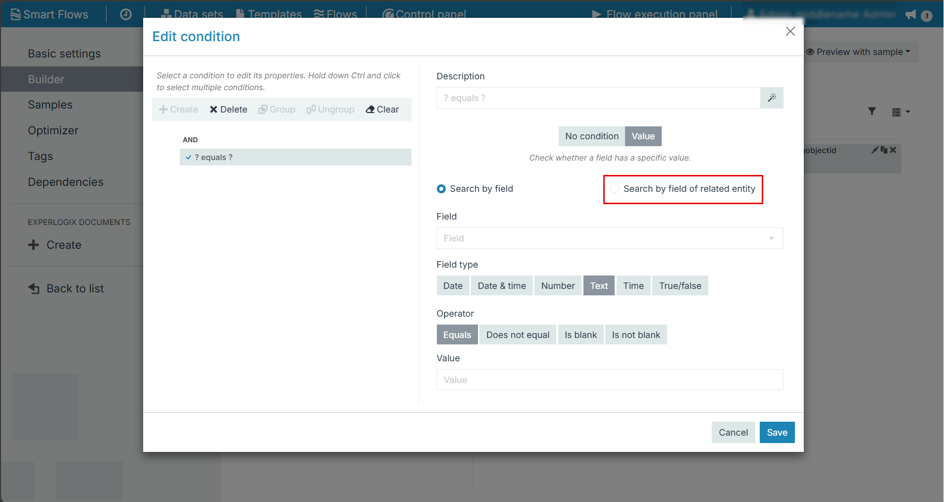 Note: When creating a condition, you can test your data set and filtered relations by using the "Preview Sample" dropdown in the upper right corner. The data set does not have to be saved, it can be used in the preview stage.