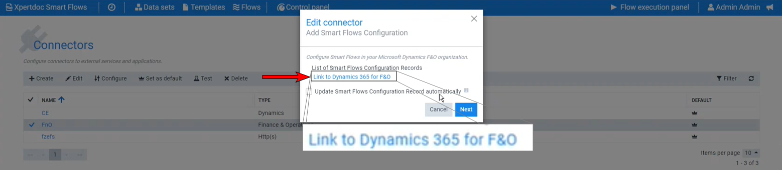Please ensure you've downloaded and installed the Experlogix app for Microsoft Dynamics 365 F&O. For instructions, refer to Installing the Experlogix App for Microsoft Dynamics 365 F&O. If you are not an Administrator role, you can temporarily change your role by checking the checkbox that allows you to apply the Smart Flows Administrator role to the connector user during Microsoft Dynamics 365 F&O connector setup.