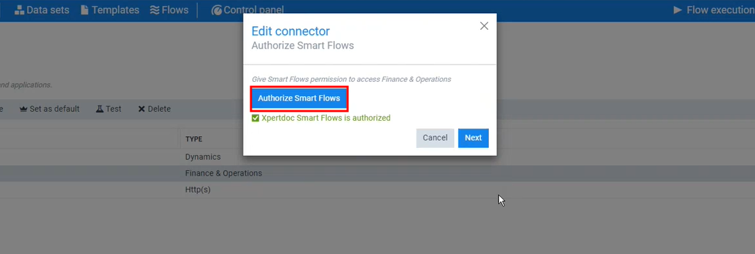 The Edit Connector Authorize Smart Flows window displays.
