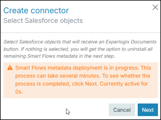 | 13. | Based upon the selection, a new process is started where the Experlogix Documents button is added to the SalesForce objects, and this process can take several minutes. Progress can be followed in the Orange screen by clicking the ‘Next’ button regularly. |