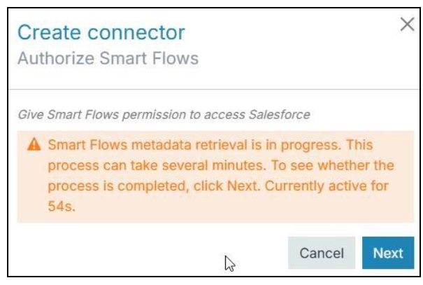 | 11. | During the first setup of the connector, Metadata will be retrieved from Salesforce, and this process can take several minutes. Progress can be followed in the 'Orange' screen by clicking the Next button regularly. |