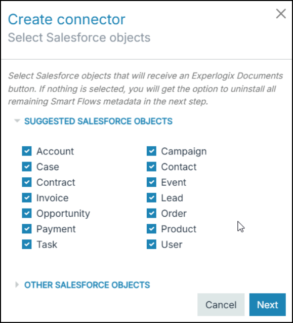 | 12. | After obtaining all Metadata, a list is displayed of all SalesForce objects where an Experlogix Documents button will be added. Please select only those pages where such a button is really desired. |