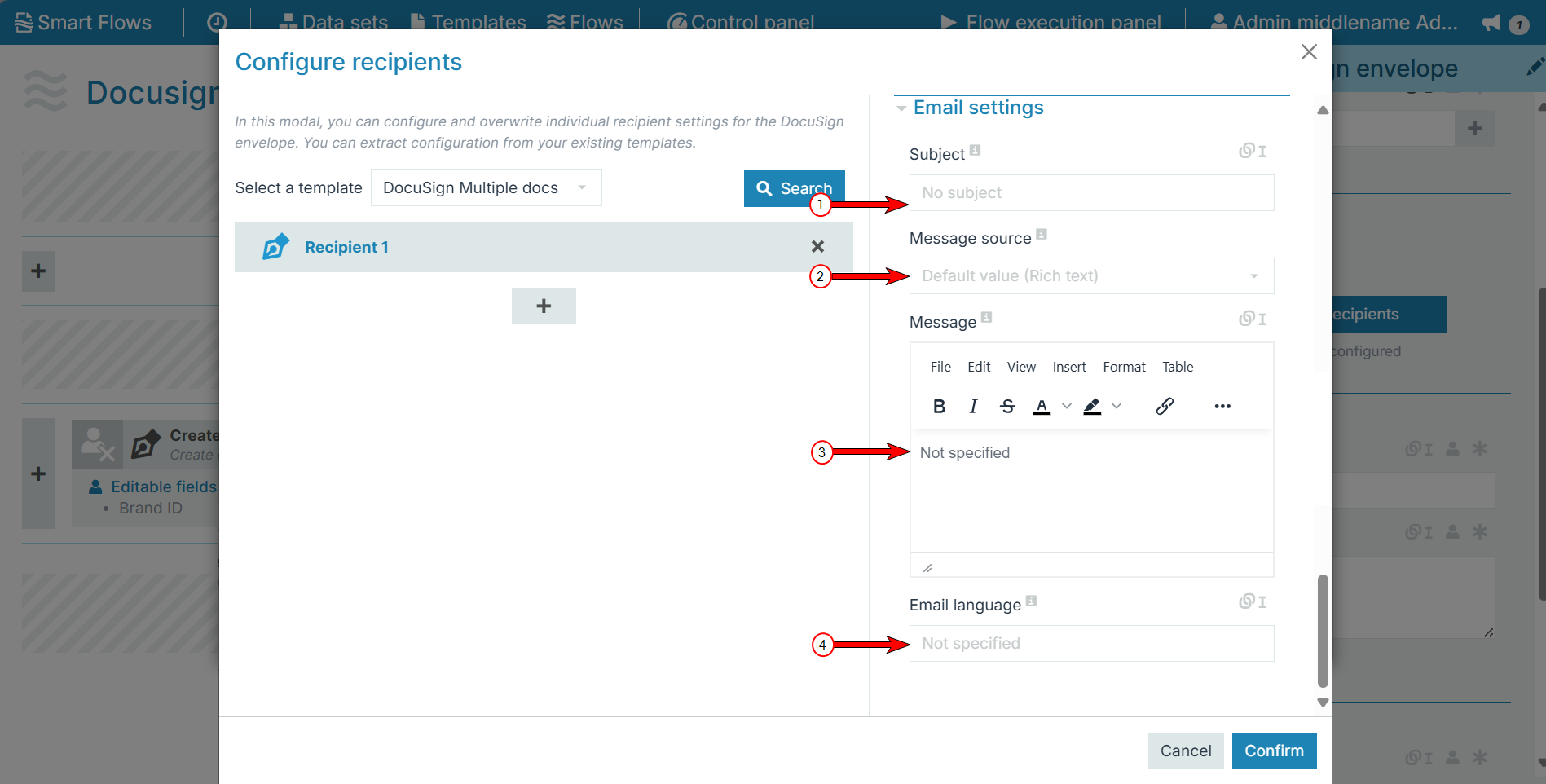 Designers can configure the following settings for multiple e-mail recipients in the Configure recipients dialog: