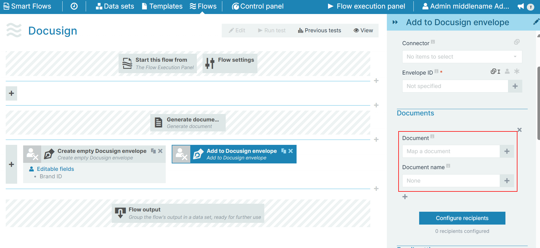 The Add to Docusign Envelope flow block allows the end users to add a document to an existing envelope and configure additional properties of the envelope. This envelope can be an envelope already existing in the Docusign account or created and saved in draft version upfront using the Create empty DocuSign Envelope flow block.