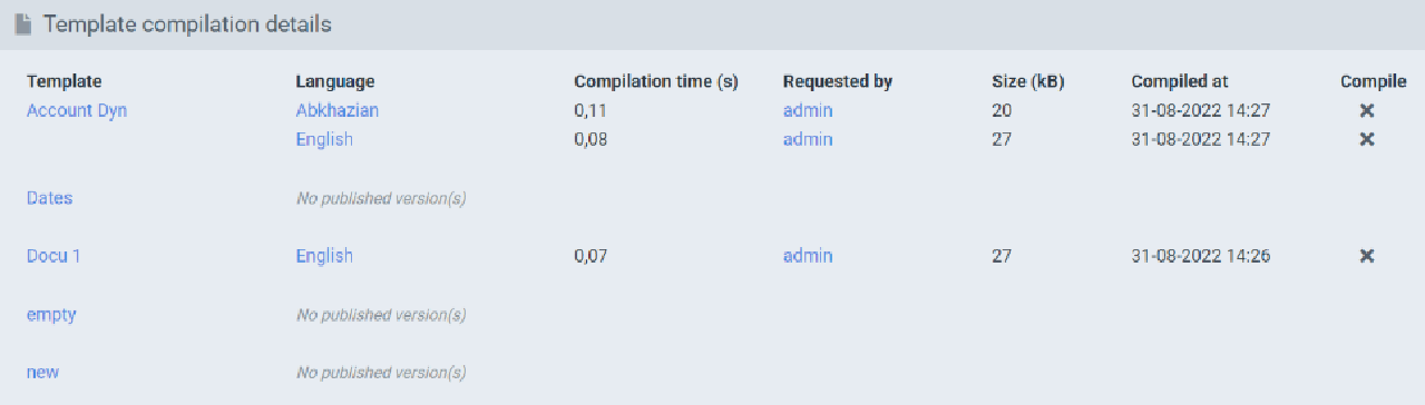 If the template is yet to compile, it allows you to compile it. If already compiled, you can clear the cached version of a template by clicking the "x" icon. |