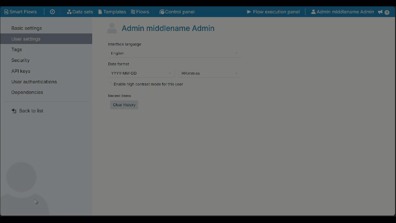 Click 'Clear History' under the Recent Items section to clear the recent item history for the selected user. |