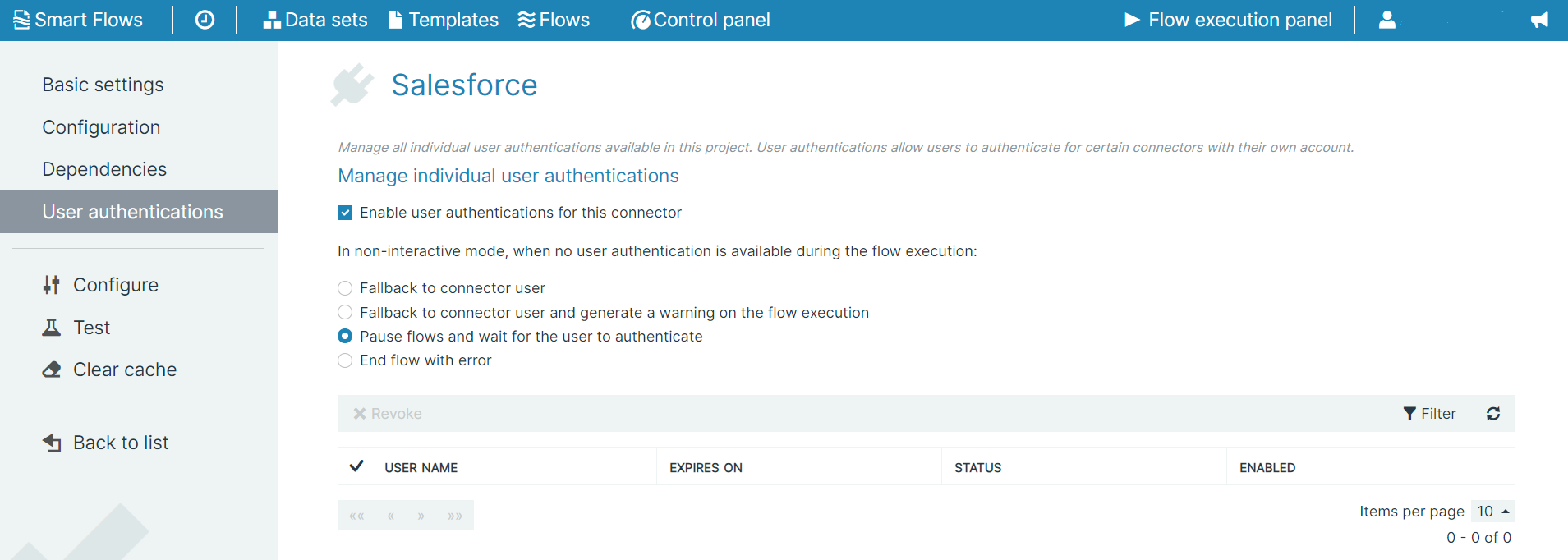 Checked(ON): any authentication-enabled connector users can start flow execution. The user’s individual authentication will be used to execute the steps related to the authentication enabled connector. Unchecked(OFF): the connector behaves like in previous Smart Flows versions, meaning that all data transactions will be carried out under the identity of the service users authenticated during connector setup. |