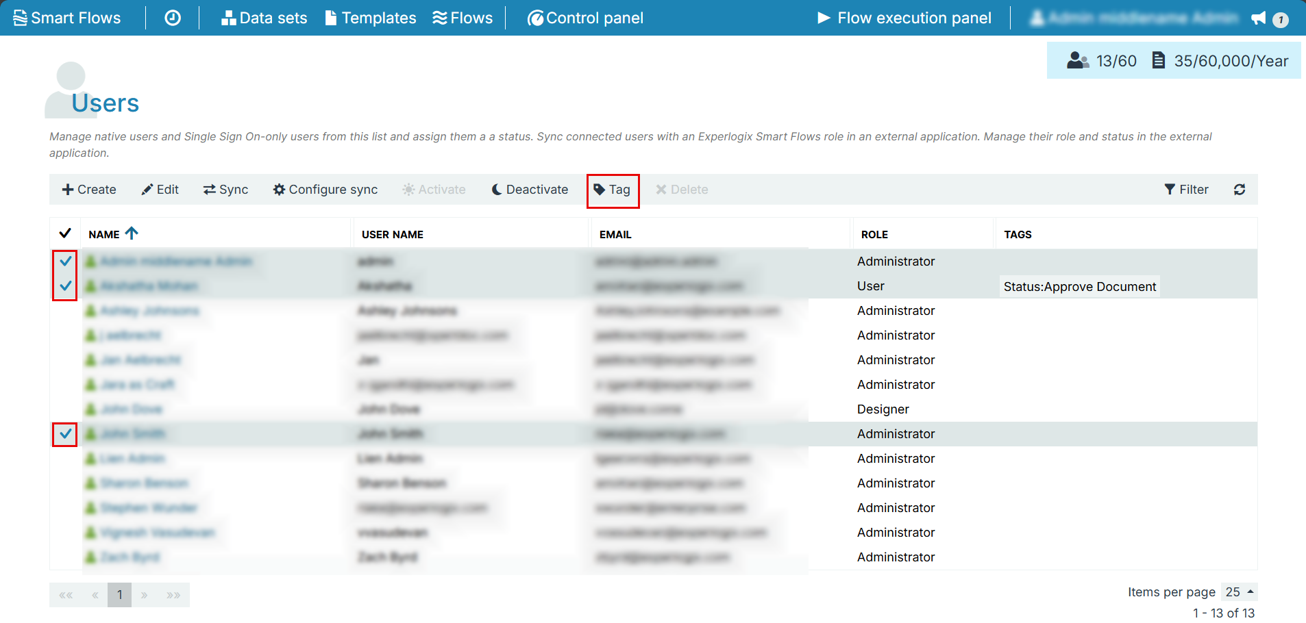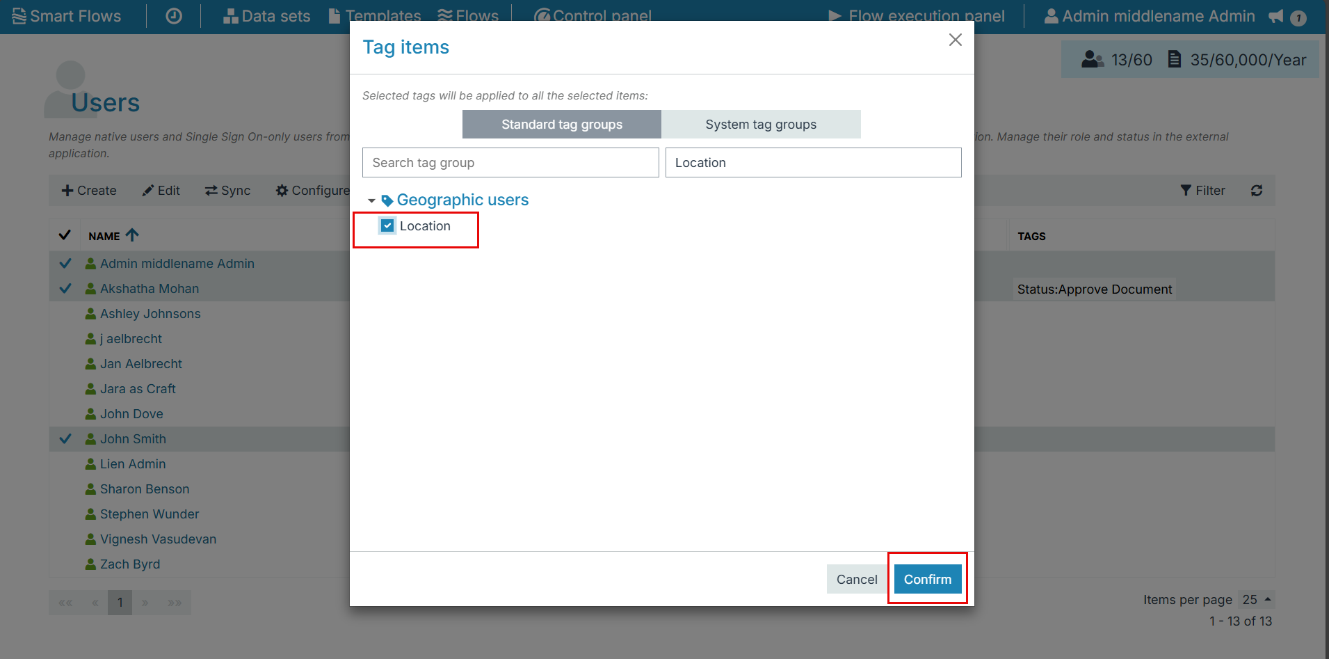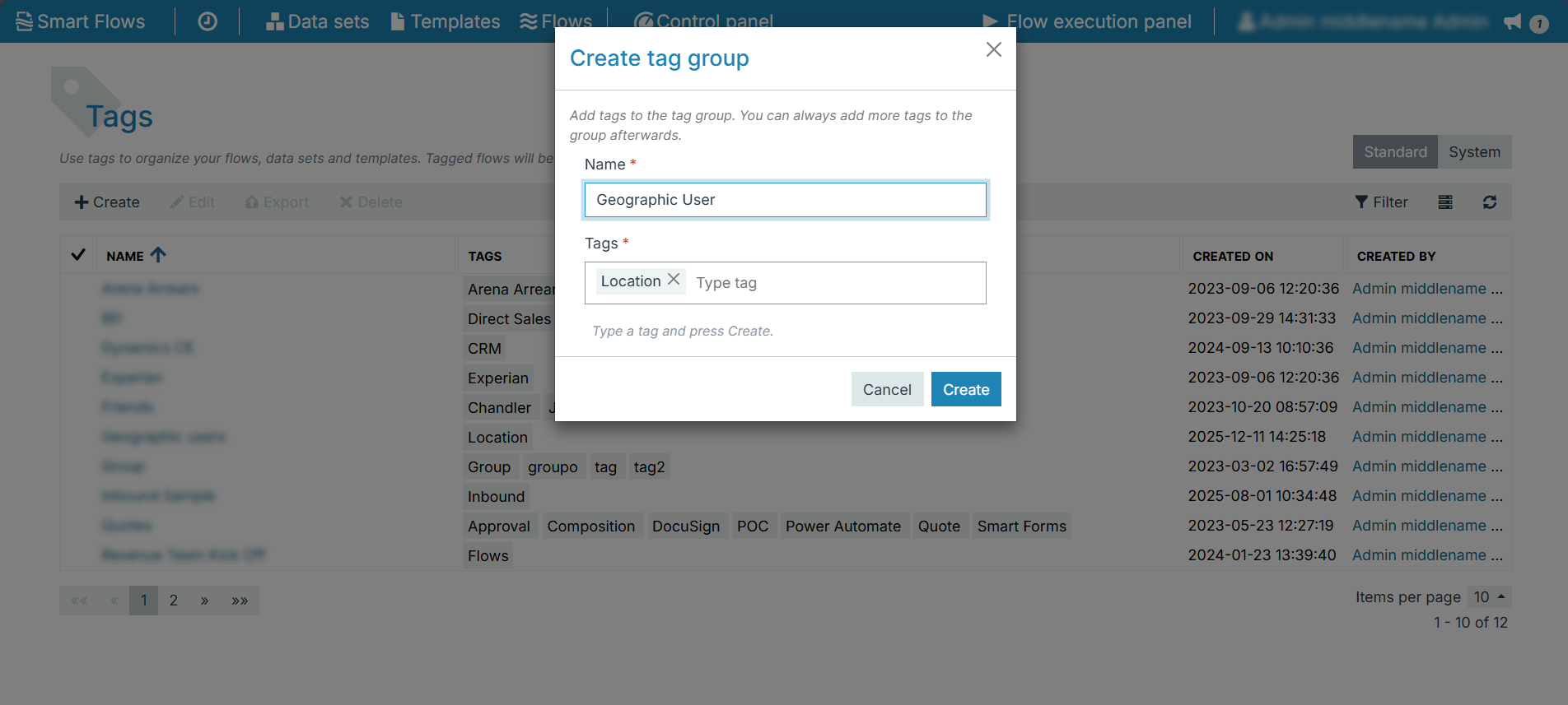 Administrators can categorize Smart Flows users into groups such as departments, business units, locations, or roles. This user tagging functionality is consistent with the existing tag group and tag model available for Flows, Templates, and Data sets.