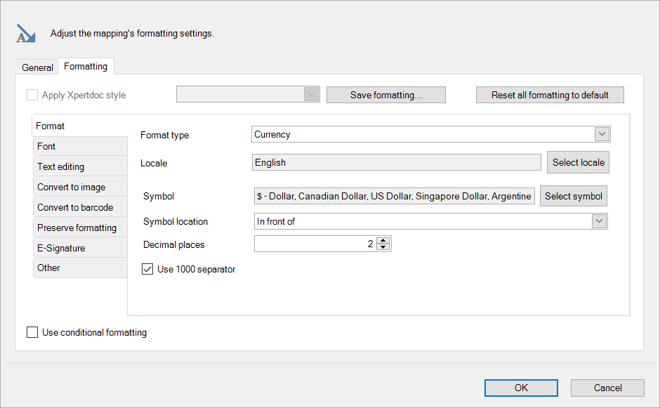 The mapping window is where you apply formatting to the selected mapping. Double-click a mapping in the Mapping tab of the Smart Flows pane (or select a mapping and select Settings) to bring it up.
