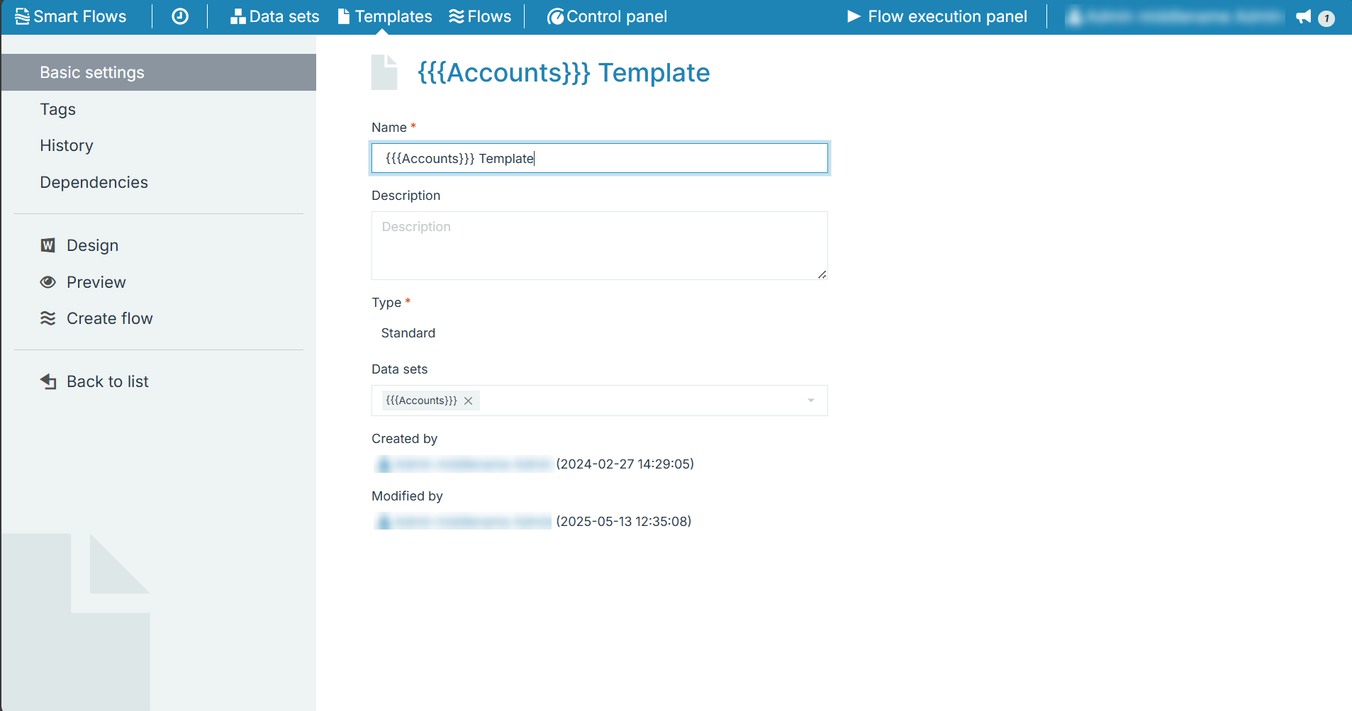 The template’s detail view provides access to its Basic Settings, where you can modify the template’s Name, Description, and associated Data sets.